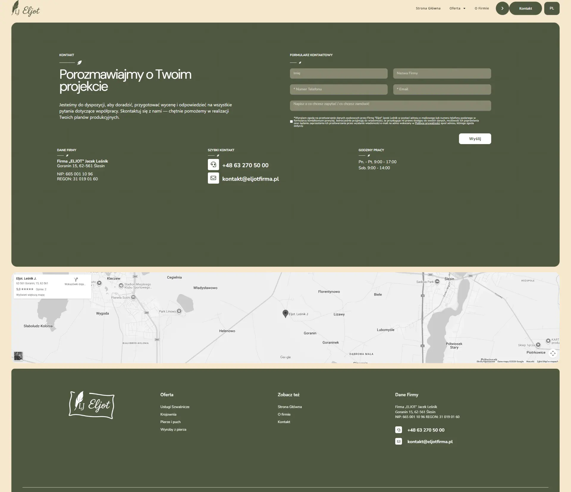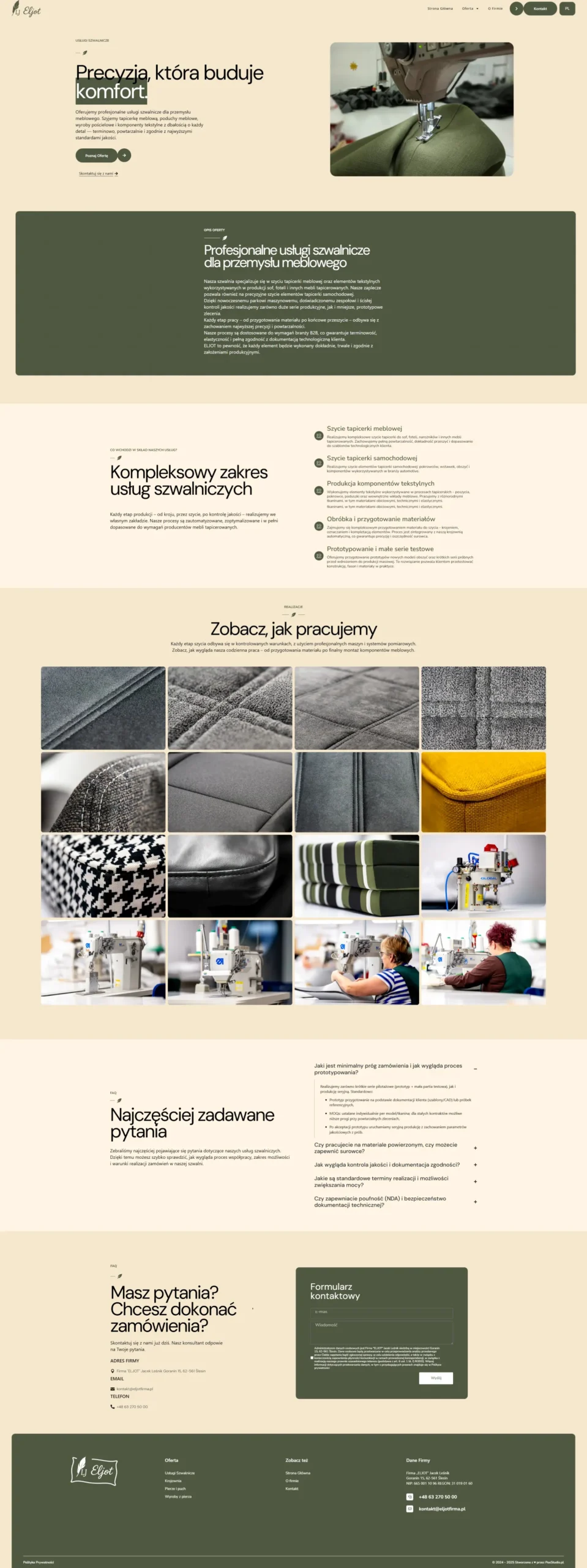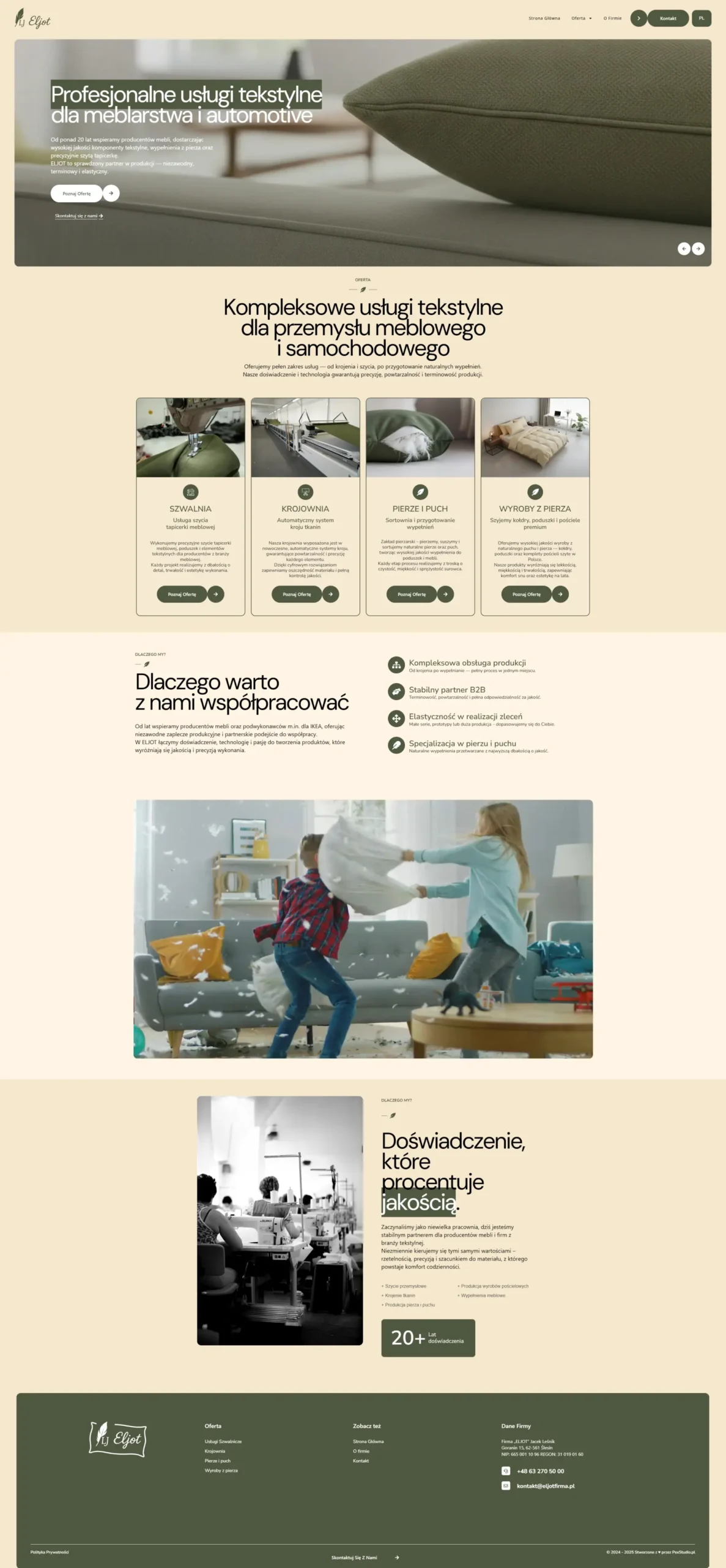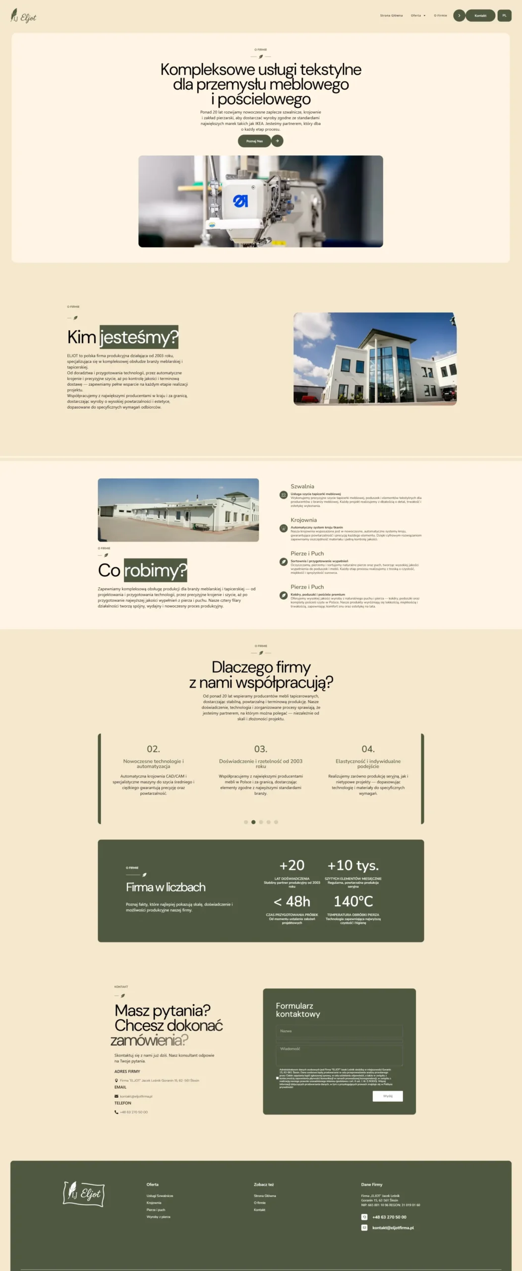 ELJOT to przykład przedsiębiorstwa o ogromnym potencjale produkcyjnym – z własną krojownią, szwalnią i zakładem pierzarskim – które potrzebowało wizerunku dorównującego jakości jego wyrobów. Dotychczasowa obecność firmy w sieci była barierą, a nie wsparciem sprzedaży: oferta w formie prostej listy i trudne do odnalezienia dane kontaktowe skutecznie utrudniały pozyskiwanie partnerów B2B.