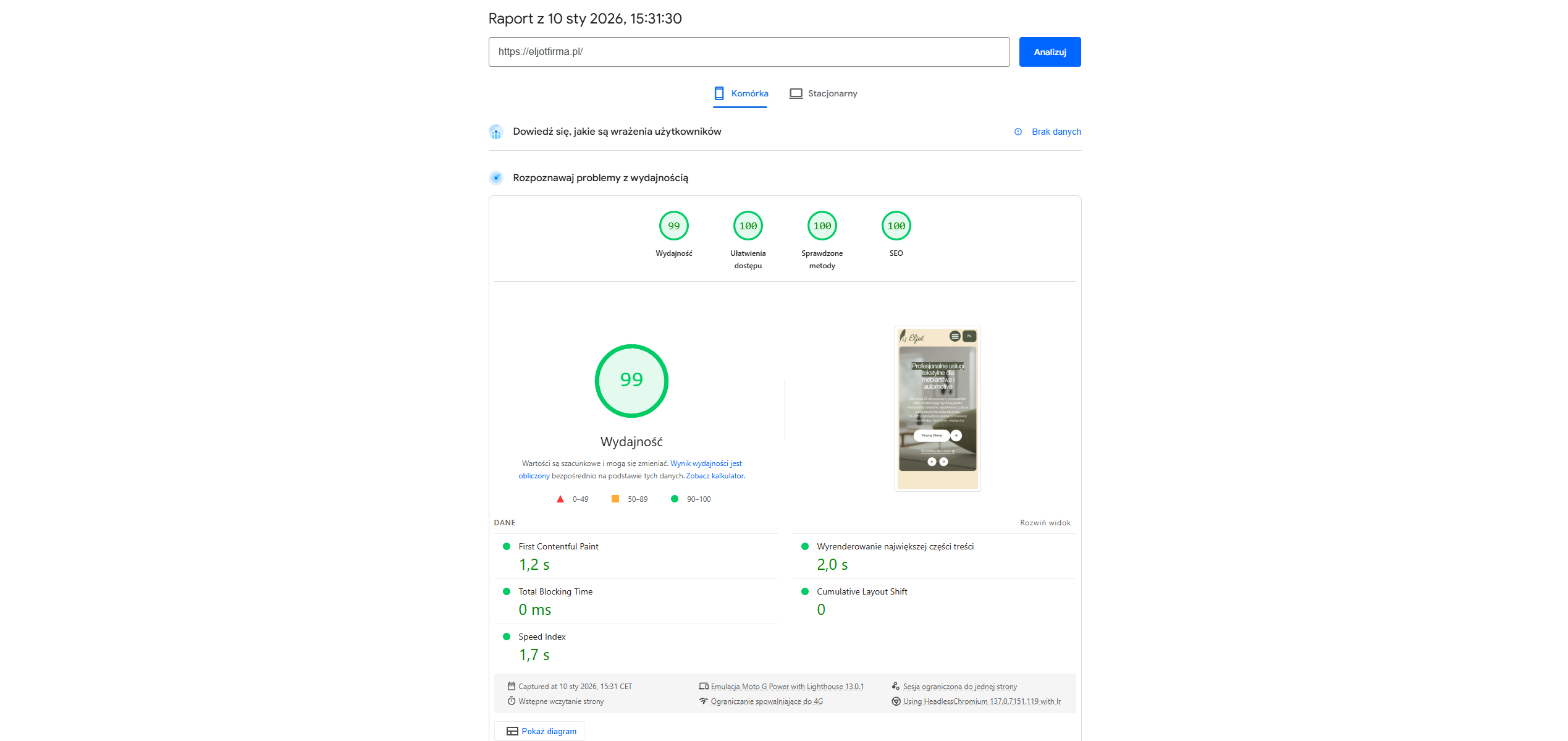 Optymalizacja techniczna: Wyniki PageSpeed 99/100 i pełna responsywność.