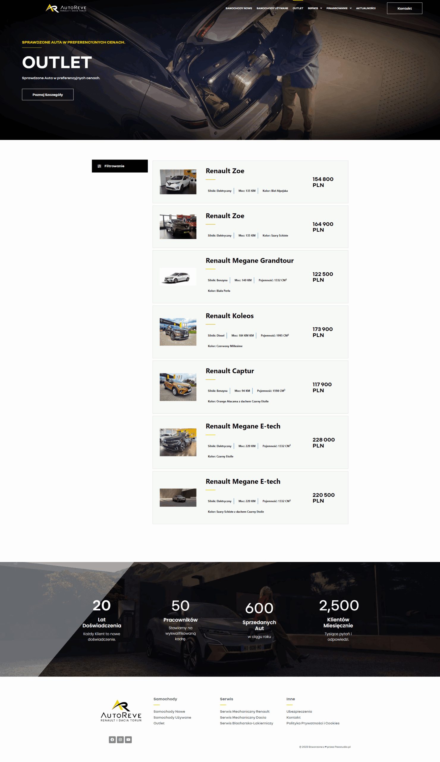 Całość została wykonana w CMS WordPress, który umożliwia szybką rozbudowę serwisu o nowe sekcje – gdy będzie taka potrzeba. Tworząc stronę postawiłem na wykorzystanie bardzo dobrych jakościowo zdjęć, które udostępnił Zamawiający. Poza klasycznymi aktualnościami mamy tu dostęp do rozbudowanej sekcji Outlet, gdzie odwiedzający stronę ma możliwość szybkiego i łatwego filtrowania dostępnej oferty z tej kategorii aut.