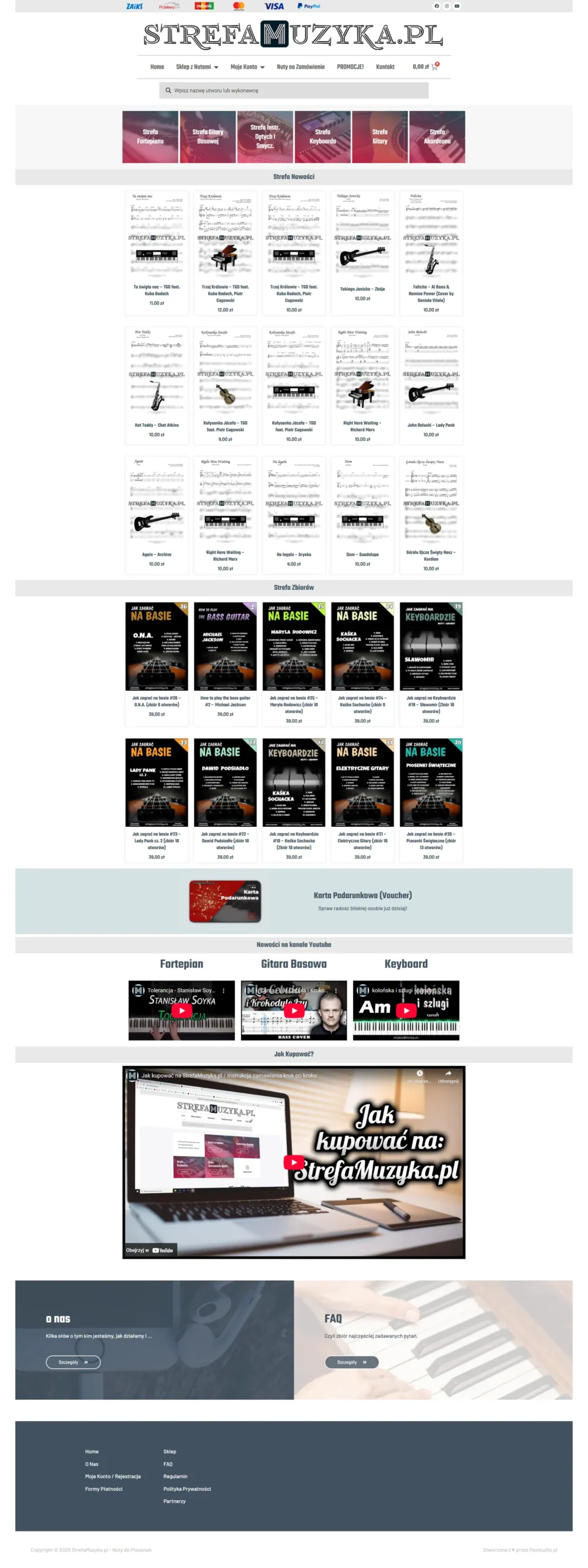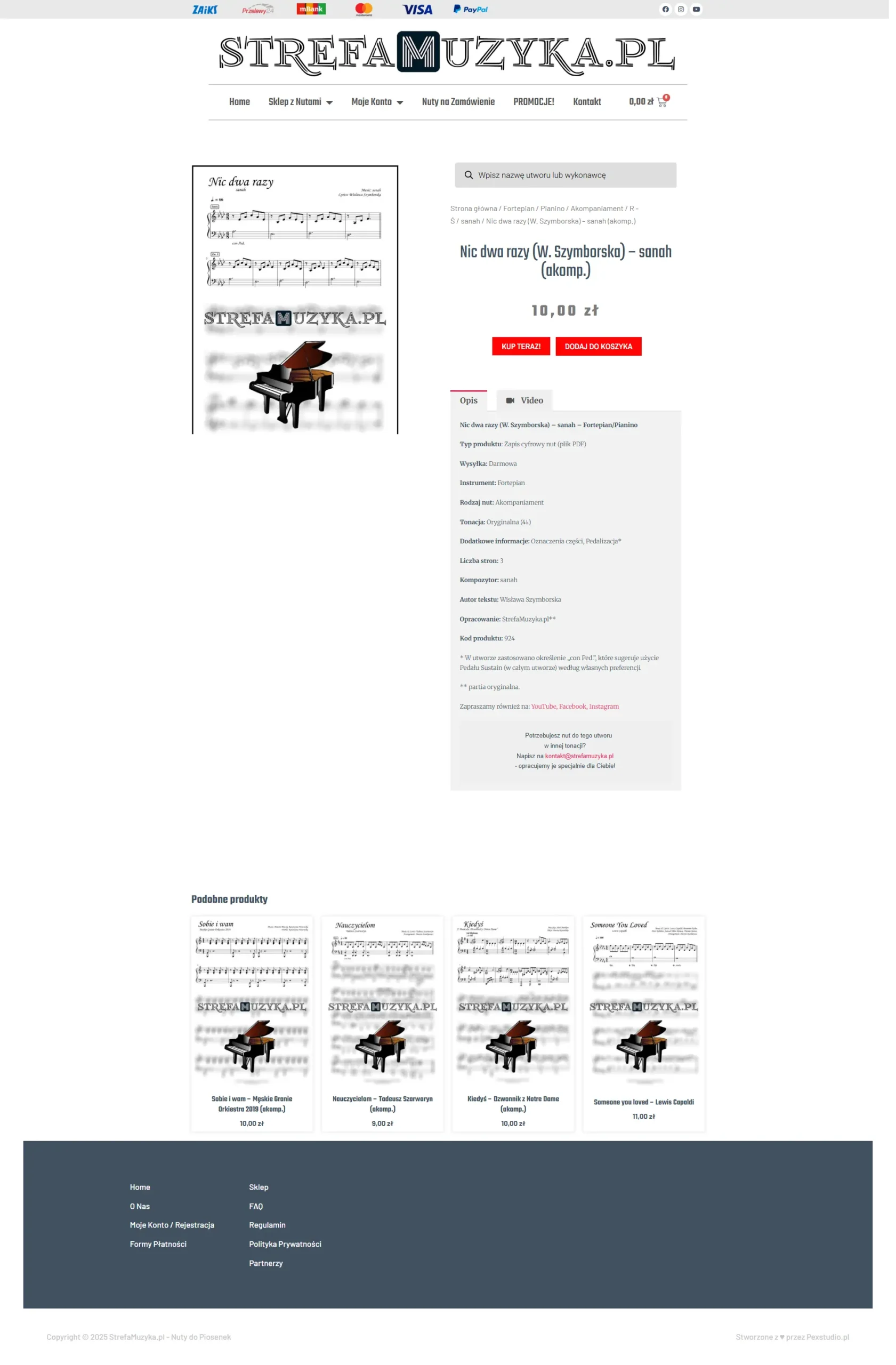 Sklep internetowy StrefaMuzyka.pl to miejsce, w którym możecie kupić nuty do setek utworów – zarówno polskich jak i zagranicznych. Wszystko wykonane w przejrzystej i przystępnej stylistyce. Nuty udostępniane są dla Klienta w formie pliku cyfrowego, do którego kupujący otrzymuje dostęp po opłaceniu zamówienia. A sama płatność możliwa jest poprzez tzw. szybką płatność online – Blik / PayNow / Przelewy24