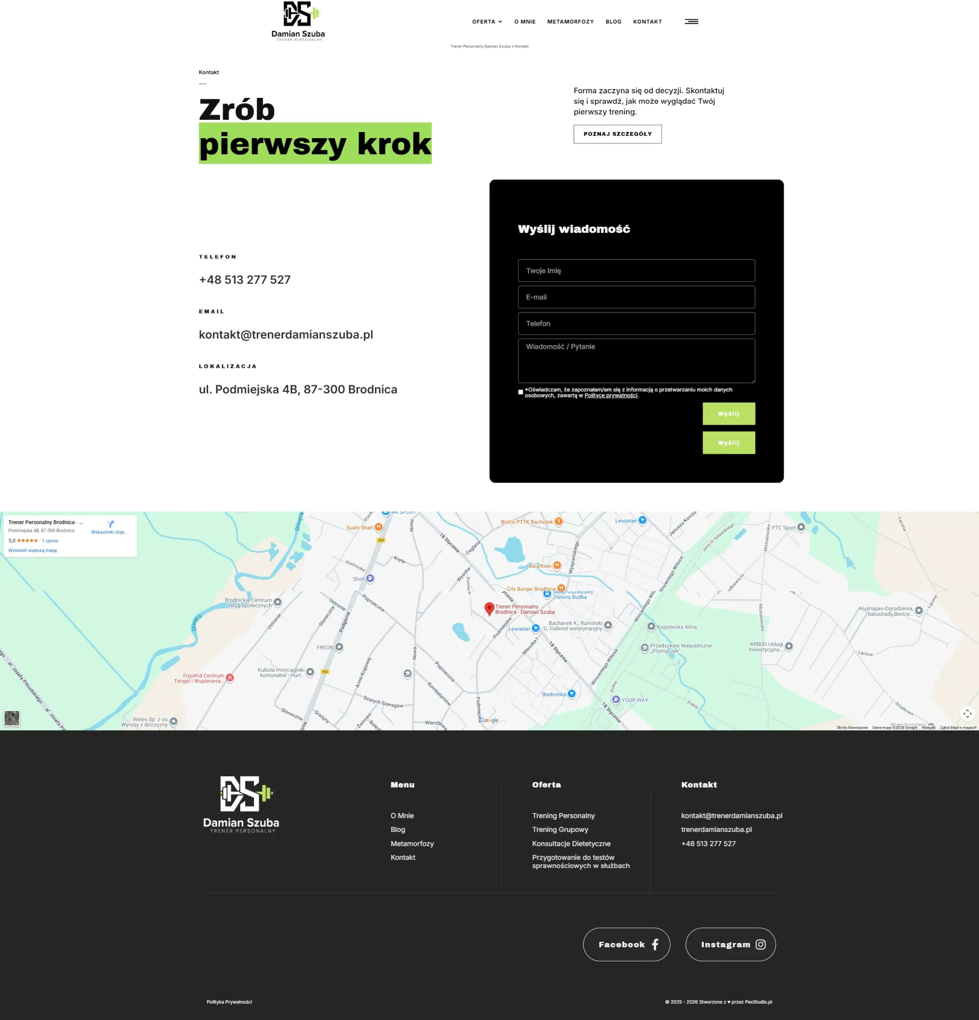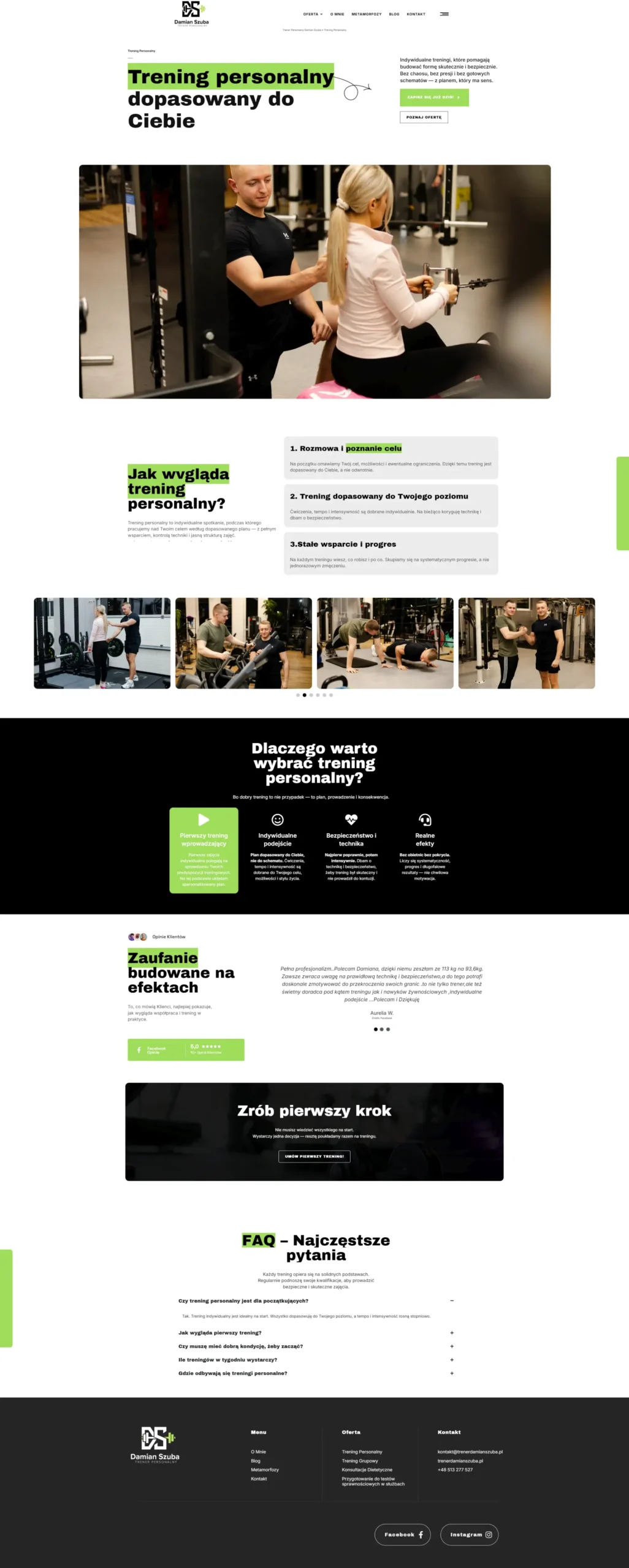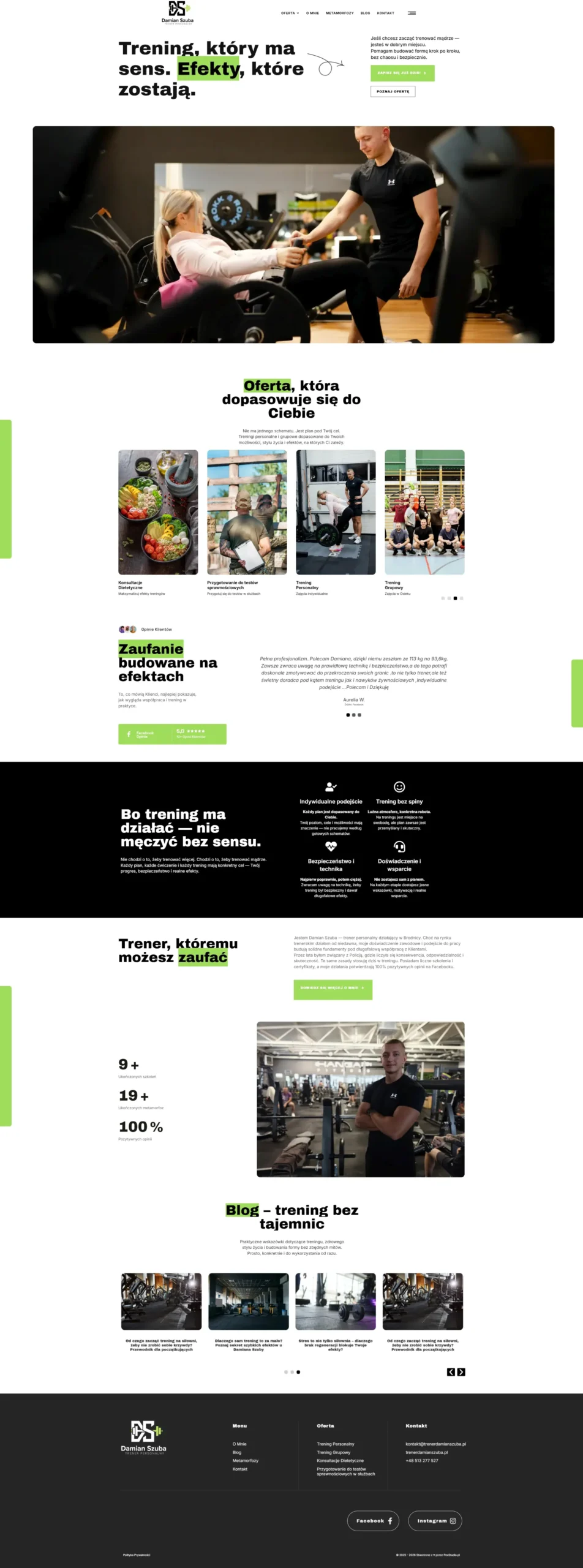 Dla Damiana Szuby, trenera personalnego z Brodnicy, przygotowałem kompleksowe rozwiązanie wizerunkowe i sprzedażowe, które wspiera jego działalność w zakresie treningów indywidualnych oraz zajęć grupowych. Damian potrzebował profesjonalnej obecności w sieci, która nie tylko zaprezentuje jego ofertę, ale stanie się realnym narzędziem do pozyskiwania nowych podopiecznych.