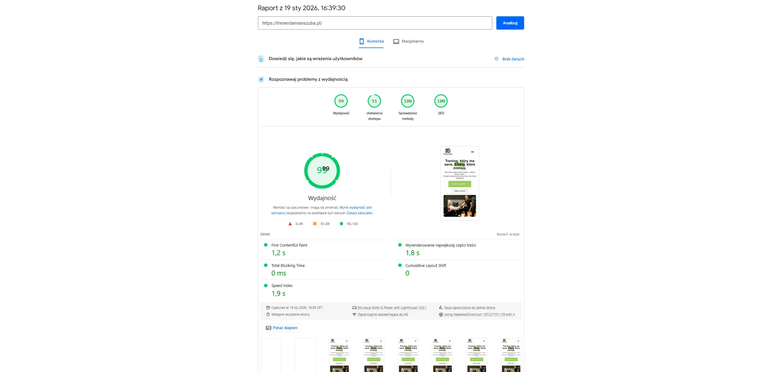 Projektując stronę internetową, postawiłem na ekstremalną optymalizację techniczną, co jest moim znakiem rozpoznawczym. Strona osiąga fenomenalne wyniki w testach Google PageSpeed Insights, notując 99/100 punktów w kategorii wydajności na urządzeniach mobilnych oraz „czyste setki” w polach dostępności, sprawdzonych metod i SEO. Dzięki temu użytkownicy mogą błyskawicznie zapoznać się z ofertą, a strona posiada silny sygnał rankingowy dla wyszukiwarki.